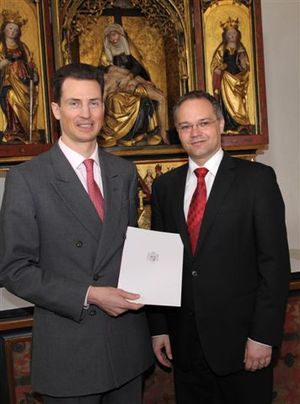 Former Prime Minister of Liechtenstein Klaus Tschütscher (on the right) receiving a government contract from Alois in 2009
