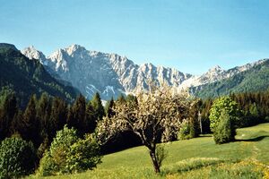 The Karawanks[1][2] or Karavankas[3][4] or Karavanks[5][6] (Slovene: Karavanke; ألمانية: Karawanken, النطق الألماني: [kaʁaˈvaŋkŋ̍] ( listen)) are a mountain range of the Southern Limestone Alps on the border between Slovenia to the south and Austria to the north. With a total length of 120 كيلومتر (75 mi) in an east–west direction, the Karawanks chain is one of the longest ranges in Europe.[7] It is traversed by important trade routes and has a great tourist significance. Geographically and geologically, it is divided into the higher Western Karawanks and the lower-lying Eastern Karawanks. It is traversed by the Periadriatic Seam, separating the Apulian tectonic plate from the Eurasian Plate.