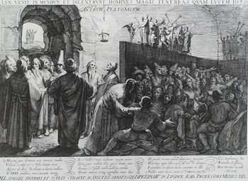 سقراط: فإذا كان عليه أن يحكم على هذه الظلال من جديد، و أن ينافس السجناء الذين لم يتحرروا من أغلالهم قط، في الوقت الذي تكون عيناه فيه مازالت معتمة زائغة، وقبل أن تعتاد الظلمة، وهو أمر يحتاج إلى بعض الوقت، ألن يسخروا منه، و يقولوا إنه لم يصعد إلى أعلى إلا لكي يفسد أبصاره، وإن الصعود أمر لا يستحق منا عناء التفكير فيه ؟ فإذا ما حاول أحد أن يحررهم من أغلالهم. ويقودهم إلى أعلى، واستطاعوا أن يضعوا أيديهم عليه، ألن يجهروا عليه بالفعل ؟