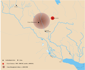 أم الدباغية Umm Al-Dabaghiyah تل أثري في سفوح جبل سنجار في شمال غربي العراق، أبعاده 100×85 م وارتفاعه 4 م، وقد نقبت الباحثة الإنكليزية ديانا كيركبرايد D.Kirkbride في الأعوام 1971- 1974 عن الآثار التي يضمها هذا التل، وتم تحديد اثنتي عشرة طبقة أثرية سُكنت كلها بين نهاية الألفية السابعة وبداية الألفية السادسة ق.م.، أي بين نحو 6200 و5750 ق.م.[4]