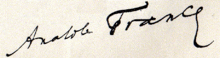 أناتول فرانس (Anatole France ؛ بالفرنسية: [anatɔl fʁɑ̃s] ؛ اسمه الأصلي فرانسوا-أناتول ثيبو François-Anatole Thibault ؛ [frɑ̃swa anatɔl tibo] ؛ وُلِد 16 أبريل 1844 توفي 12 أكتوبر 1924) هو روائي وشاعر وصحفي وناقد فرنسي، كان العديد من أعماله من أعلى المبيعات. Ironic and skeptical, he was considered in his day the ideal French man of letters. He was a member of the Académie française, and won the 1921 Nobel Prize in Literature "in recognition of his brilliant literary achievements, characterized as they are by a nobility of style, a profound human sympathy, grace, and a true Gallic temperament".[1]