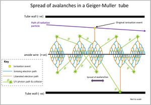 If there were to be only one avalanche per original ionizing event, then the number of excited molecules would be in the order of 106 to 108. However the production of multiple avalanches results in an increased multiplication factor which can produce 109 to 1010 ion pairs.[5] The creation of multiple avalanches is due to the production of UV photons in the original avalanche, which are not affected by the electric field and move laterally to the axis of the anode to instigate further ionizing events by collision with gas molecules. These collisions produce further avalanches, which in turn produce more photons, and thereby more avalanches in a chain reaction which spreads laterally through the fill gas, and envelops the anode wire. The accompanying diagram shows this graphically. The speed of propagation of the avalanches is typically 2–4 cm per microsecond, so that for common sizes of tubes the complete ionization of the gas around the anode takes just a few microseconds.[5] This short, intense pulse of current can be measured as a count event in the form of a voltage pulse developed across an external electrical resistor. This can be in the order of volts, thus making further electronic processing simple.