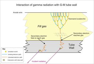 Used for gamma radiation detection above energies of about 25 KeV, this type generally has an overall wall thickness of about 1-2 mm of chrome steel. Because most high energy gamma photons will pass through the low density fill gas without interacting, the tube uses the interaction of photons on the molecules of the wall material to produce high energy secondary electrons within the wall. Some of these electrons are produced close enough to the inner wall of the tube to escape into the fill gas. As soon as this happens the electron drifts to the anode and an electron avalanche occurs as though the free electron had been created within the gas.[5] The avalanche is a secondary effect of a process that starts within the tube wall with the production of electrons that migrate to the inner surface of the tube wall, and then enter the fill gas. This effect is considerably attenuated at low energies below about 20 KeV [4]