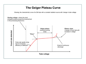 This is shown in more detail in the accompanying Geiger Plateau Curve diagram. If the tube voltage is progressively increased from zero the efficiency of detection will rise until the most energetic radiation starts to produce pulses which can be detected by the electronics. This is the "starting voltage". Increasing the voltage still further results in rapidly rising counts until the "knee" or threshold of the plateau is reached, where the rate of increase of counts falls off. This is where the tube voltage is sufficient to allow a complete discharge along the anode for each detected radiation count, and the effect of different radiation energies are equal. However, the plateau has a slight slope mainly due to the lower electric fields at the ends of the anode because of tube geometry. As the tube voltage is increased, these fields strengthen to produce avalanches. At the end of the plateau the count rate begins to increase rapidly again, until the onset of continuous discharge where the tube cannot detect radiation, and may be damaged.[5]