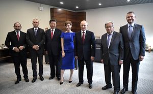 Guterres with Nikol Pashinyan, Rumen Radev, Xi Jinping, Sophie Shevardnadze, Vladimir Putin and Peter Pellegrini at the St. Petersburg International Economic Forum, June 2019