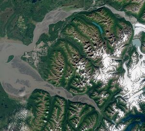 Anchorage is in Southcentral Alaska, at the terminus of the Cook Inlet, on a peninsula formed by the Knik Arm to the north and the Turnagain Arm to the south.[10] First settled as a tent city near the mouth of Ship Creek in 1915 when construction on the Alaska Railroad began, Anchorage was incorporated as a city in November 1920.[11][12] In September 1975, the City of Anchorage merged with the Greater Anchorage Area Borough, creating the Municipality of Anchorage.[13] The municipal city limits span 1،961.1 sq mi (5،079.2 km2), encompassing the urban core, a joint military base,[14] several outlying communities, and almost all of Chugach State Park.[15] Because of this, less than 10% of the Municipality (or Muni) is populated, with the highest concentration of people in the 100 square-mile area that makes up the city proper, on a promontory at the headwaters of the inlet, commonly called Anchorage, the City of Anchorage, or the Anchorage Bowl.[16]