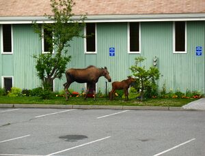 A diverse wildlife population exists within urban Anchorage and the surrounding area. Approximately 250 black bears and 60 grizzly bears live in the area. Bears are regularly sighted within the city. Moose are also a common sight; in the Anchorage Bowl, there is a summer population of approximately 250 moose, increasing to as many as 1,000 during the winter. They are a hazard to drivers, with over 100 moose killed by cars each year. Two people were stomped to death, in 1993 and 1995, in Anchorage.[34] Cross-country skiers and dog mushers using city trails have been charged by moose on numerous occasions; the Alaska Department of Fish and Game has to kill some individual aggressive moose in the city every year. Thinhorn sheep are often viewed quite close to the road at Windy Point.[35] Approximately thirty northern timber wolves reside in the Anchorage area. In 2007, several dogs were killed by timber wolves while on walks with their owners.[36][37] There are also beaver dams in local creeks and lakes, and sightings of foxes and kits in parking lots close to wooded areas in the spring are common. Along the Seward Highway headed toward Kenai, there are common sightings of beluga whales in the Turnagain Arm. Lynxes are occasionally sighted in Anchorage as well. Within the Municipality there are also a number of streams that host salmon runs. Fishing for salmon at Ship Creek next to downtown is popular in the summer.