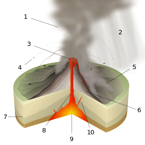 Diagram of Peléan eruption. (key: 1. Ash plume 2. Volcanic ash rain 3. Lava dome 4. Volcanic bomb 5. Pyroclastic flow 6. Layers of lava and ash 7. Stratum 8. Magma conduit 9. Magma chamber 10. Dike) Click for larger version.