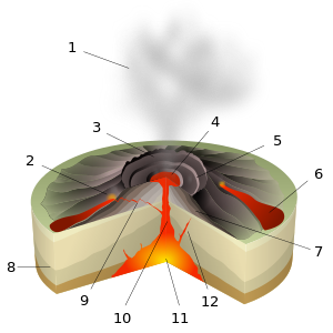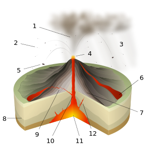 Diagram of a Hawaiian eruption. (key: 1. Ash plume 2. Lava fountain 3. Crater 4. Lava lake 5. Fumaroles 6. Lava flow 7. Layers of lava and ash 8. Stratum 9. Sill 10. Magma conduit 11. Magma chamber 12. Dike) Click for larger version.