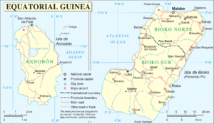 Annobón (إسپانية: Provincia de Annobón;[3][4] برتغالية: Ano-Bom) is a province of Equatorial Guinea. The province consists of the island of Annobón and its associated islets in the Gulf of Guinea. Annobón is the smallest province of Equatorial Guinea in both area and population. According to the 2015 census, Annobón had 5,314 inhabitants,[1] a small population increase from the 5,008 registered by the 2001 census. The official language is Spanish but most of the inhabitants speak a creole form of Portuguese. The island's main industries are fishing and forestry.