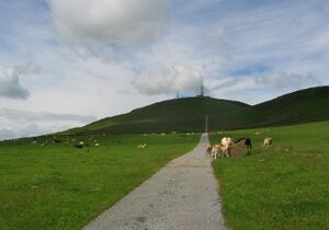 Angus can be split into three geographic areas. To the north and west, the topography is mountainous. This is the area of the Grampian Mountains, Mounth hills and Five Glens of Angus, which is sparsely populated and where the main industry is hill farming. Glas Maol – the highest point in Angus at 1,068 m (3,504 ft) – can be found here, on the tripoint boundary with Perthshire and Aberdeenshire. To the south and east the topography consists of rolling hills (such as the Sidlaws) bordering the sea; this area is well populated, with the larger towns. In between lies Strathmore (the Great Valley), which is a fertile agricultural area noted for the growing of potatoes, soft fruit and the raising of Aberdeen Angus cattle.