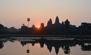 ربما يكون معبد أنجكور وات، قرب أنجكور ثوم، أهم أثر معماري في كمبوديا، وهو يغطي ما يقرب من 2,6 كم² وله شكل هرمي. ويحاكي هذا الشكل المقر الأسطوري للآلهة الهندوسية. تم إنشاء معبد أنجكور وات في القرن الثاني عشر الميلادي تكريمًا للإله الهندوسي ڤشنو، وكان يُستخدم مرصدًا فلكيًا إضافة للأغراض الدينية. وأصبح أنجكور وات فيما بعد ضريحًا للملك الذي أمر بإنشائه.