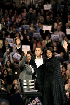 ![]() اوپرا وينفري في حفل ميلادها الخمسين في فندق بل-إير، لوس أنجلس، 2004 | |