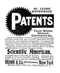 Among the earliest requests made to the publishers of the Scientific American was for advice concerning the procuring of letters-patent for new inventions, there being at that time no professional patent solicitors. This department of the business developed with great rapidity, and a branch office for it was soon opened in Washington, D.C. For many years Munn & Co. enjoyed a virtual monopoly of this class of business, and upward of 100,000 applications for patents were made by this house. Munn strictly adhered to a principle never to invest a penny in any patented invention.[1]