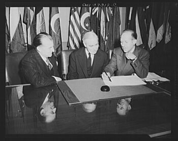 ممثلا مصر وتركيا يوقعان إعلان تأسيس الأمم المتحدة. أورهان إرالپ، القائم بأعمال تركيا، وجوسف گرو، نائب وزير الخارجية الأمريكي، يراقبان بينما الوزير المصري محمود حسن يوقّع الإعلان. في واشنطن العاصمة، 1 يناير 1945.