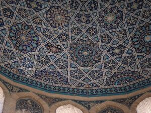 One of the most impressive architectural features of the mausoleum is the circular dome covering the main hall, whose surface is covered in colourful mosaic which forms intricate ornamental patterns consisting of flowers and stars, creating a visual metaphor for the heavens. No comparable contemporary parallels can be found at Urgench, as some of the architectural features, such as the decorations mentioned above, do not appear in other monuments built during the lifetime of Turabek-Khanum, around 1330. Thus, it is difficult to date the building so early. These features do, however, appear in Central Asia later, during the reign of Timur, a warlord of Turco-Mongol descent. New technologies, such as mosaic faience, show up in Timur's earliest buildings, such as the Aq Saray palace in Shahrisabz, in Uzbekistan, which was begun in 1379 but was still unfinished in 1404.[8]