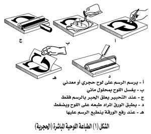 تعد جميع الرسوم التي يتضمنها النص، ومنها الصور، لتصلح للنقل بأسلوب فن الحفر Graving، فتصور للحصول على شفافةٍ لها نصَفَ تُظْهِر دقائقها وظلالها ونسقها اللوني. و ذلك باستعمال شاشة ضوئية شبكية تجزئ الصورة إلى صفوف من النقاط الدقيقة طولاً وعرضاً. وثمة تقنية أخرى تدعى الطباعة الغَرَوانية Collotype أو الجيلاتينية Photo Gelatin Print. وفيها تميز كثافة ألوان الخيال بين الفاتح جداً والداكن جداً بضبط كمية الحبر الذي يغطي أجزاء الصورة، فتظهِر الفروقَ بين القيمة اللونية وقوة اللون عن طريق التدرج اللوني لاعن طريق الألوان النَصَف، وهي تستخدم في نسخ الأعمال الفنية الدقيقة المتقنة.
