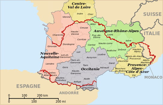 ![]() منطقة أوكسيتاني ضمن الحيز الأوكسيتاني (الخط الأحمر). |