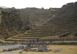 Around the mid-15th century, the Inca emperor Pachacuti conquered and razed Ollantaytambo; the town and the nearby region were incorporated into his personal estate.[1] The emperor rebuilt the town with sumptuous constructions and undertook extensive works of terracing and irrigation in the Urubamba Valley; the town provided lodging for the Inca nobility, while the terraces were farmed by yanakuna, retainers of the emperor.[4] After Pachacuti's death, the estate came under the administration of his panaqa, his family clan.[5]