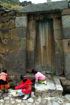 The main settlement at Ollantaytambo has an orthogonal layout with four longitudinal streets crossed by seven parallel streets.[12] At the center of this grid, the Incas built a large plaza that may have been up to four blocks large; it was open to the east and surrounded by halls and other town blocks on its other three sides.[13][14] All blocks on the southern half of the town were built to the same design; each comprised two kanchas, walled compounds with four one-room buildings around a central courtyard.[15] Buildings in the northern half are more varied in design; however, most are in such a bad condition that their original plan is hard to establish.[16]