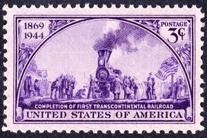 The railroad opened for through traffic on May 10, 1869 when CPRR President Leland Stanford ceremonially drove the gold "Last Spike" (later often referred to as the "Golden Spike") with a silver hammer at Promontory Summit.[10][11] The coast-to-coast railroad connection revolutionized the settlement and economy of the American West. It brought the western states and territories into alignment with the northern Union states and made transporting passengers and goods coast-to-coast considerably quicker and less expensive.