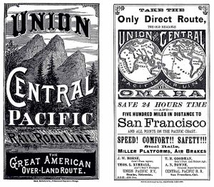 The CPRR eventually purchased 53 ميل (85 km) of UPRR-built grade from Promontory Summit (MP 828) to Ogden, Utah Territory (MP 881), which became the interchange point between trains of the two roads. The transcontinental line was popularly known as the Overland Route after the principal passenger rail service that operated over the length of the line until 1962.[19]