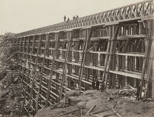 The Union Pacific reached the new railroad town of Cheyenne in December 1867, having laid about 270 ميل (430 km) that year. They paused over the winter, preparing to push the track over Evans (Sherman's) pass. At 8،247 أقدام (2،514 m), Evans pass is the highest point reached on the transcontinental railroad. About 4 ميل (6.4 km) beyond Evans pass, the railroad had to build an extensive bridge over the Dale Creek canyon (41°06′14″N 105°27′17″W / 41.103803°N 105.454797°W). The Dale Creek Crossing was one of their more difficult railroad engineering challenges.[70] Dale Creek Bridge was 650 أقدام (200 m) long and 125 أقدام (38 m) above Dale Creek.[71] The bridge components were pre-built of timber in Chicago, Illinois, and then shipped on rail cars to Dale Creek for assembly. The eastern and western approaches to the bridge site, near the highest elevation on the transcontinental railroad, required cutting through granite for nearly a mile on each side.[72] The initial Dale Creek bridge had a train speed limit of 4 ميل (6.4 km) per hour across the bridge. Beyond Dale Creek, railroad construction paused at what became the town of Laramie, Wyoming, to build a bridge across the Laramie River.