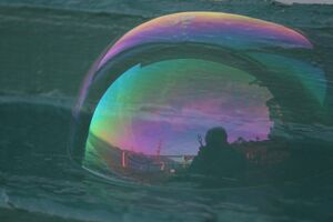 Although Newton rejected the wave theory, he noticed its potential to explain colors, including the colors of "thin plates" (e.g., "Newton's rings", and the colors of skylight reflected in soap bubbles), on the assumption that light consists of periodic waves, with the lowest frequencies (longest wavelengths) at the red end of the spectrum, and the highest frequencies (shortest wavelengths) at the violet end. In 1672 he published a heavy hint to that effect,[53][54] but contemporary supporters of the wave theory failed to act on it: Robert Hooke treated light as a periodic sequence of pulses but did not use frequency as the criterion of color,[55] while Huygens treated the waves as individual pulses without any periodicity;[56] and Pardies died young in 1673. Newton himself tried to explain colors of thin plates using the corpuscular theory, by supposing that his corpuscles had the wavelike property of alternating between "fits of easy transmission" and "fits of easy reflection",[57] the distance between like "fits" depending on the color and the medium [58] and, awkwardly, on the angle of refraction or reflection into that medium.[59][60] More awkwardly still, this theory required thin plates to reflect only at the back surface, although thick plates manifestly reflected also at the front surface.[61] It was not until 1801 that Thomas Young, in the Bakerian Lecture for that year, cited Newton's hint,[62] and accounted for the colors of a thin plate as the combined effect of the front and back reflections, which reinforce or cancel each other according to the wavelength and the thickness.[62] Young similarly explained the colors of "striated surfaces" (e.g., gratings) as the wavelength-dependent reinforcement or cancellation of reflections from adjacent lines.[62] He described this reinforcement or cancellation as interference.
