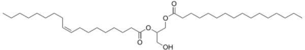 An example of a diacyl-glycerol shown on the right. This DAG is 1-palmitoyl-2-oleoyl-glycerol, which contains side-chains derived from palmitic acid and oleic acid. Diacylglycerols can also have many other combinations of fatty acids attached at either the C-1 and C-2 positions or the C-1 and C-3 positions of the glycerol molecule. 1,2 disubstituted glycerols are always chiral, 1,3 disubstituted glycerols are chiral if the substituents are different from each other.