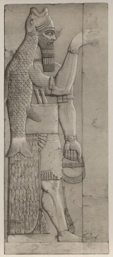 Apkallu reliefs appear prominently in Neo-Assyrian palaces, notably the constructions of Ashurnasirpal II of the 9th century BC. They appear in one of three forms, bird-headed, human-headed or dressed in fish-skin cloaks. They have also been found on reliefs from the reign of Sennacherib.[1] The form taken of a man covered with the 'pelt' of a fish is first seen the Kassite period, continuing is used to the period of Persian Babylonia – the form was popular during the Neo-Assyrian and Neo-Babylonian periods.[47]