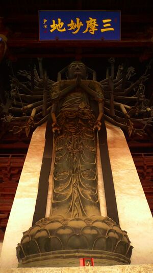 This manifestation of Avalokiteśvara is known as Sahrasasbhuja Avalokiteśvara ("Thousand-armed Avalokiteśvara), and is among the bodhisattva's most popular iconographic forms across China, Japan and Korea.[46][47][48]