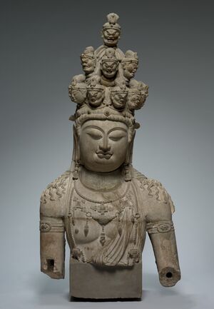 Eleven-faced Avalokitesvara (Sanskrit: Ekādaśa-mukha Avalokiteśvara; Chinese: 十一面觀音) is an appearance of the Bodhisattva that has eleven heads. The ten heads atop the Bodhisattva's head awaken living beings in the ten realms of existence. |