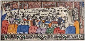 بين عامي 1896 و 1910 ، تطور نص الملك نجويا من نظام تصوير إلى نص أبجدي مقطعي جزئيًا ، مصممًا لتمثيل جميع الأصوات في لغة باموم لشعب شو-موم يظهره في هذا الرسم وهو يوضح السيناريو لمجموعة من وزرائه.