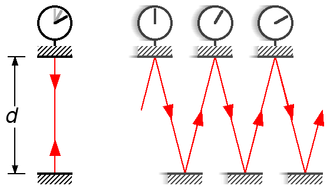 بالنسبة للساعة أ والتي يتحرك معها أحمد فهو يشاهد أن نبضة ضوئية تنعكس بين المرئتين خلال زمن قدره حيث أن المسافة بينهما d وسرعة الضوء c. يسجل زمن الانعكاس عند كل مرآة ويكون الزمن الكلي هو مجموع تلك المراحل .
