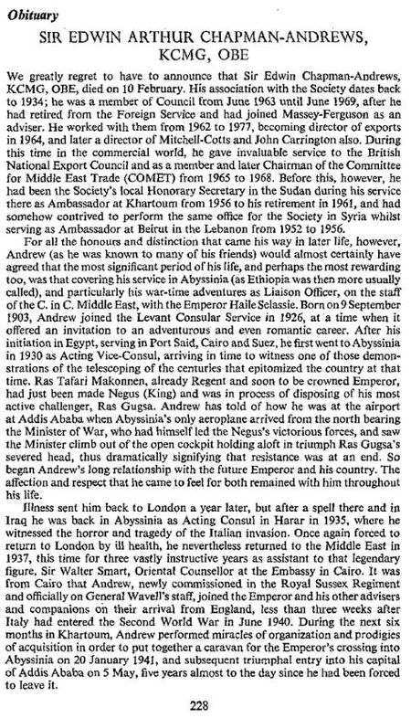 - ^ Peregrine Fellowes (2007). "Obituary: Sir Edwin Arthur Chapman‐Andrews, KCMG, OBE". Asian Affairs. p. 228.