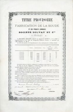 He founded the company Solvay & Cie and established his first factory at Couillet (now merged into Charleroi, Belgium) in 1863, and further perfected the process until 1872, when he patented it. Soon, Solvay process plants were established in the United Kingdom, the United States, Ukraine,[3] Russia, Germany and Austria. Today, about 70 Solvay process plants are still operational worldwide.[1]