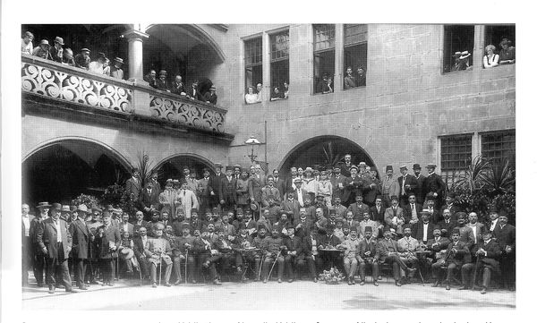 باحة مبنى البلدية مع أعضاء جمعية تركيا الفتاة، يقف إرنست يك ومفوضية الدراسات التركية في هايلبرون، 8 يوليو 1911. يك يقف في منتصف الخلفية (خلف المصباح المثبت على الحائط)، ممسكاً بقبعته المخلوعة في يمناه.