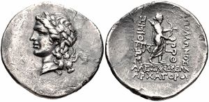 عملة (دراخمة) الإسكندرية، 102-66 ق.م.. Obverse: Laureate head of Apollo. Reverse: Apollo Smintheus standing right, quiver over shoulder, holding bow, arrow, and patera, ΑΠΟΛΛΩΝΟΣ ΣΜΙΝΘΕΩΣ [ΑΛΕΞΑΝΔΡΕΩΝ ΑΡΧΑΓΟΡΟΥ in exergue].