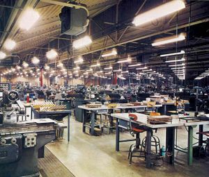 تعد إضاءة سطوح العمل إضاءة كافية مطلباً أساسياً، وغالباً ما تكون الإضاءة فيها بمصابيح تألق غازية ذات سوية عالية مثبتة في السقف. ومن المتفق عليه عالمياً أن تراوح شدة الإضاءة بين 10% و25% من الضوء الطبيعي في يوم مشرق. وتختلف مشكلة الإضاءة هنا عنها في المكاتب، لأن التعامل في المكاتب غالباً مع الورق الأبيض، في حين يرتبط العمل في المصنع بمواد مختلفة متباينة الألوان أقل عكساً للضوء من الورق توفر راحة أكثر للبصر مهما كانت شدة الإضاءة، وقد أثبتت الخبرة الطويلة أن ارتفاع سوية الإضاءة في المعامل يزيد الإنتاج ويعطي مردوداً يعوض ما ينفق عليها. والجدير بالملاحظة هنا أن بعض المهمات الصناعية الدقيقة تتطلب إضاءة إضافية أو متممة قد تبلغ سويتها سوية الإضاءة الطبيعية في نهار مشرق كتجمع الآلات الدقيقة والساعات وآلات التصوير، وكذلك مكاتب الرسم التي يفضل الرسامون العاملون عليها سوية عالية من الإضاءة. ويراعي مصممو الإضاءة في المصانع عادة سهولة تنظيف مصادر الضوء وصيانتها، لأن حرارة المصابيح تسبب تياراً هوائياً صاعداً يحمل معه ذرات الغبار والهباب من أماكن العمل فتتوضع على السطوح العاكسة للضوء وتخفف من ضيائها، كما أن الحرارة المنبعثة من مصادر الضوء ومن الآلات ومن أجسام العمال أنفسهم تفترض توفير تهوية كافية لمصادر الضوء تخفف من حرارتها وتحافظ على تألقها، لأن الحرارة المفرطة تقلل من تألق الضوء وتخفف مردوده. يتبع في إضاءة المصانع أسلوبان أساسيان أولهما الإضاءة من علو مع ترك فرجات ومسافات متناظرة بين الأضواء، وثانيهما الإضاءة المتتابعة والمستمرة على صفوف. والأسلوب الأول أكثر مواءمة للعنابر الكبيرة المرتفعة الأسقف كحظائر الطائرات، حيث تكون الإضاءة متجانسة من غير تداخل نظراً لسعة المكان. أما الأسلوب الثاني فيمكن من تركيب الأضواء فوق خطوط العمل على ارتفاع مناسب لكي تتكامل مع ضوء النهار أو تحل محله تماماً في الليل. وقد يستخدم بعض المصانع السقوف المضيئة كلية ولاسيما تلك التي تتطلب تحكماً دقيقاً في مناخها الداخلي.