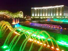 Animated fountain in Moscow's Square of Europe, lit at night.