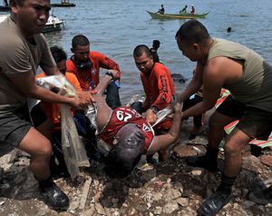 إخراج جثة صياد بالفلبين بعد انقلاب قاربه بفعل أمواج هائلة بسبب إعصار كونسون