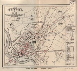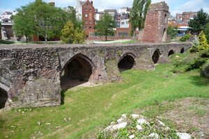 Bishop Ussher identified the Cair Pensa vel Coyt,[19] listed among the 28 cities of Britain by the History of the Britons, as Isca,[20] although David Nash Ford read it as a reference to Penselwood and thought it more likely to be Lindinis (modern Ilchester).[21] Nothing is certainly known of Exeter from the time of the Roman withdrawal from Britain around the year 410 until the seventh century.[22] By that time, the city was held by the Saxons, who had arrived in Exeter after defeating the British Dumnonians at Peonnum in Somerset in 658.[23] It seems likely that the Saxons maintained a quarter of the city for the Britons under their own laws around present-day Bartholomew Street,[24] which was known as "Britayne" Street until 1637 in memory of its former occupants.[25]