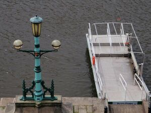 A new bridge across the Exe was opened on 29 March 1905, replacing the former Georgian bridge. Made of cast iron and steel with a three hinged arch design, it cost £25,000 and was designed by Sir John Wolfe Barry.[51] Also in 1905, electric trams replaced the horse trams[56] with a new route which passed along the High Street, down Fore Street and over the new Exe Bridge. Once across the Exe the line divided, with one route along Alphington Road and another along Cowick Street. The line to St David's Station travelled along Queen Street instead of along New North Road and the line to Heavitree was extended.[57] On 17 March 1917, a tram went out of control going down Fore Street, hit a horse-drawn wagon, then overturned on Exe Bridge; one female passenger was killed.[58] By the 1920s there were problems with congestion caused by the trams, a need for expensive track renewal work and the slow speed of the trams in Exeter's narrow streets. After much discussion, the council decided to replace the tram service with double-decker buses and the last tram ran on 19 August 1931. The only remaining Exeter tram in service is car 19, now at the Seaton Tramway.[59]