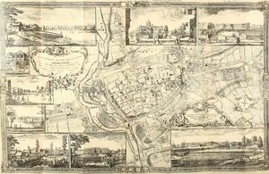 Exeter was secured for Parliament at the beginning of the English Civil War, and its defences very much strengthened, but in September 1643 it was captured by the Cornish Royalist Army led by Prince Maurice. Thereafter, the city remained firmly under the king's control until near the end of the war, being one of the final Royalist cities to fall into Parliamentarian hands.[45] The surrender of Exeter was negotiated in April 1646 at Poltimore House by Thomas Fairfax.[46] During this period, Exeter was an economically powerful city, with a strong trade of wool. This was partly due to the surrounding area which was "more fertile and better inhabited than that passed over the preceding day" according to Count Lorenzo Magalotti who visited the city when he was 26 years old.[47] Magalotti writes of over thirty thousand people being employed in the county of Devon as part of the wool and cloth industries, merchandise that was sold to "the West Indies, Spain, France and Italy".[48] Celia Fiennes also visited Exeter during this period, in the early 18th century. She remarked on the "vast trade" and "incredible quantity" in Exeter, recording that "it turns the most money in a week of anything in England", between £10,000 and £15,000.[49]