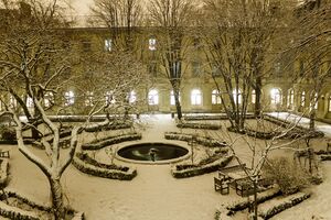 The École normale supérieure is one of a few schools that still occupy a campus in the heart of Paris. The historic Paris ENS campus is located around the rue d'Ulm, the main building being at 45 rue d'Ulm in the 5th arrondissement of Paris, which was built by architect Alphonse de Gisors and given to ENS by law in 1841.[33] Above the entrance door are sculptures of two female figures who respectively represent letters and sciences. They are portrayed sitting on either side of a medallion of Minerva, who represents wisdom. A formalised version of this frontal piece is used as the school's emblem.