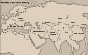 In 221 BC, China became an empire when the State of Qin ended the chaotic Warring States period through its conquest of the other six states and proclaimed the Qin Empire (221–207 BC). The Qin Empire is known for the construction of the Great Wall of China and the Terracotta Army, as well as the standardization of currency, weights, measures and writing system. It laid the foundation for China's first golden age, the Han Empire (202 BC–AD 9, AD 25–220). The Han Empire expanded into Central Asia and established trade through the Silk Road. Confucianism was, for the first time, adopted as an official state ideology. During the reign of the Emperor Wu of Han, the Xiongnu were pacified. By this time, only four empires stretched between the Pacific and the Atlantic: the Han Empire of China, the Kushan Empire, the Parthian Empire of Persia, and the Roman Empire. The collapse of the Han Empire in AD 220 saw China fragmented into the Three Kingdoms, only to be unified once again by the Jin Empire (AD 266–420). The relative weakness of the Jin Empire plunged China into political disunity that would last from AD 304 to AD 589 when the Sui Empire (AD 581–618) reunited China.[20]