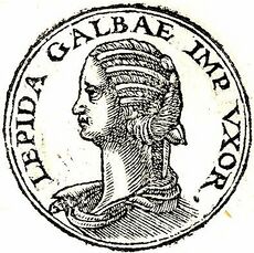 When Lepida lived, Agrippina the Younger (a widow after Gnaeus Domitius Ahenobarbus' death) tried to make shameless advances to Galba, who was devoted to his wife and thus completely uninterested. On one occasion Lepida's mother gave Agrippina the Younger, while in the company of a whole bevy of married women, a public reprimand and slapped her in the face.[5]