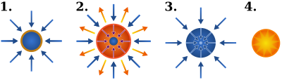 4. ويبدأ تفاعل الاندماج وتنطلق طاقة أكبر من الطاقة المستخدمة. ملحوظة: تمثل الأسهم الزرقاء عمليات الأشعة المتجهة إلى الداخل، والأسهم البرتقالية العمليات المتجهة إلى الخارج، والأسهم البنفسجية تمثل الطاقة الحرارية الضاغطة المتجهة إلى الداخل.