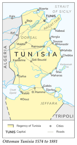 تونس العثمانية, also known as the Regency of Tunis,[1][2][3] refers to the Turkish presence in Ifriqiya from the 16th to the 19th century, when Tunis was officially integrated into the Ottoman Empire as the Eyalet of Tunis. Eventually, including all of the Maghrib except Morocco, the Ottoman Empire began with the takeover of Algiers in 1516 by the Ottoman Turkish corsair and beylerbey Aruj (Oruç Reis). The first Ottoman conquest of Tunis occurred in 1534 under the command of Khayr al-Din Barbarossa, the younger brother of Aruj, who was the Kapudan Pasha of the Ottoman Fleet during the reign of Suleiman the Magnificent. However, it was not until the final Ottoman reconquest of Tunis from Spain in 1574 that the Turks permanently acquired the former territories of Hafsid Tunisia, retaining it until the French occupation of Tunisia in 1881.