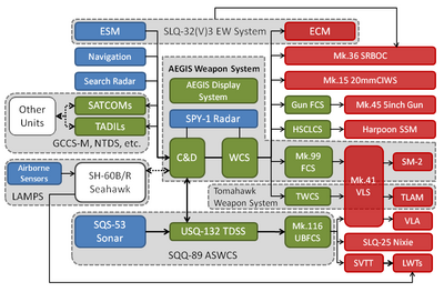 The computer-based command-and-decision (C&D) element is the core of the Aegis Combat System and came from the Naval Tactical Data System (NTDS) threat evaluation and weapons assignment (TEWA) function.[5] This interface makes the ACS capable of simultaneous operation against almost all kinds of threats.